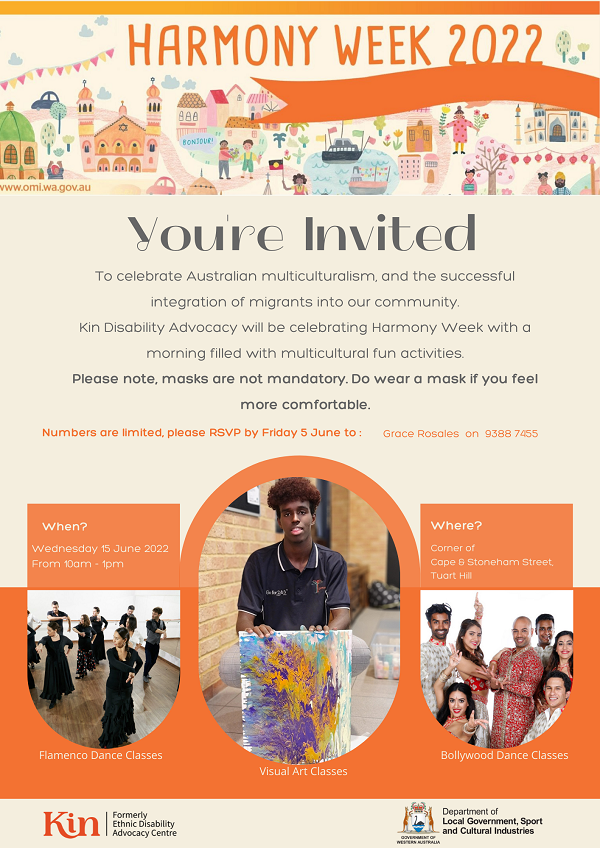 Kin Disability Advocacy will be celebrating Harmony week with a morning filled with the following multicultural activities: