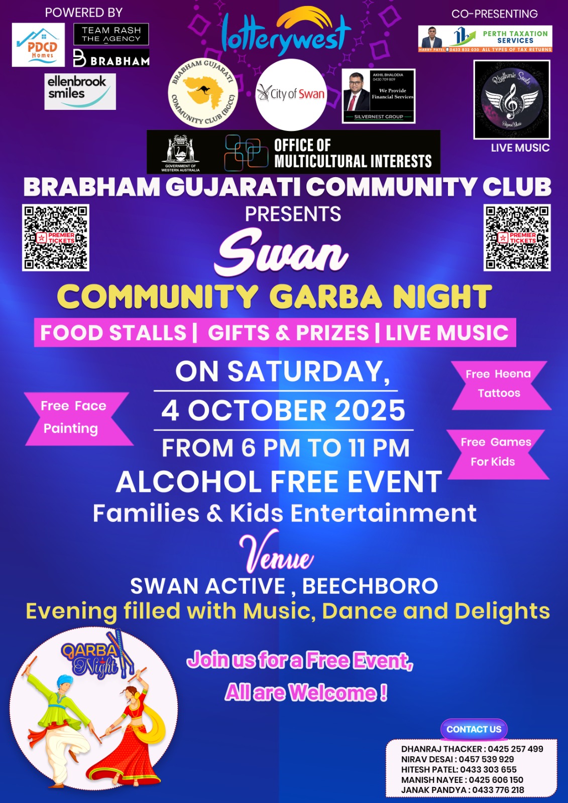 Join the Brabham Gujarati Community Club for a fun-filled Swan Community Garba Night! The night will feature live music featuring traditional Gujarati folk tunes, vibrant Garba and Raas performances and authentic food stalls as well as henna tattoos and face painting for children.