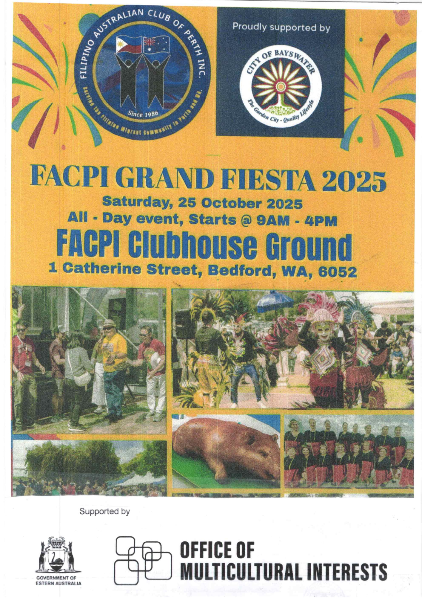 The Filipino Australian Club of Perth Inc will host the Grand Filipino Fiesta 2025! Join in a celebration of Filipino food and culture featuring vibrant cultural performances, delicious cuisine and the spirit of community.