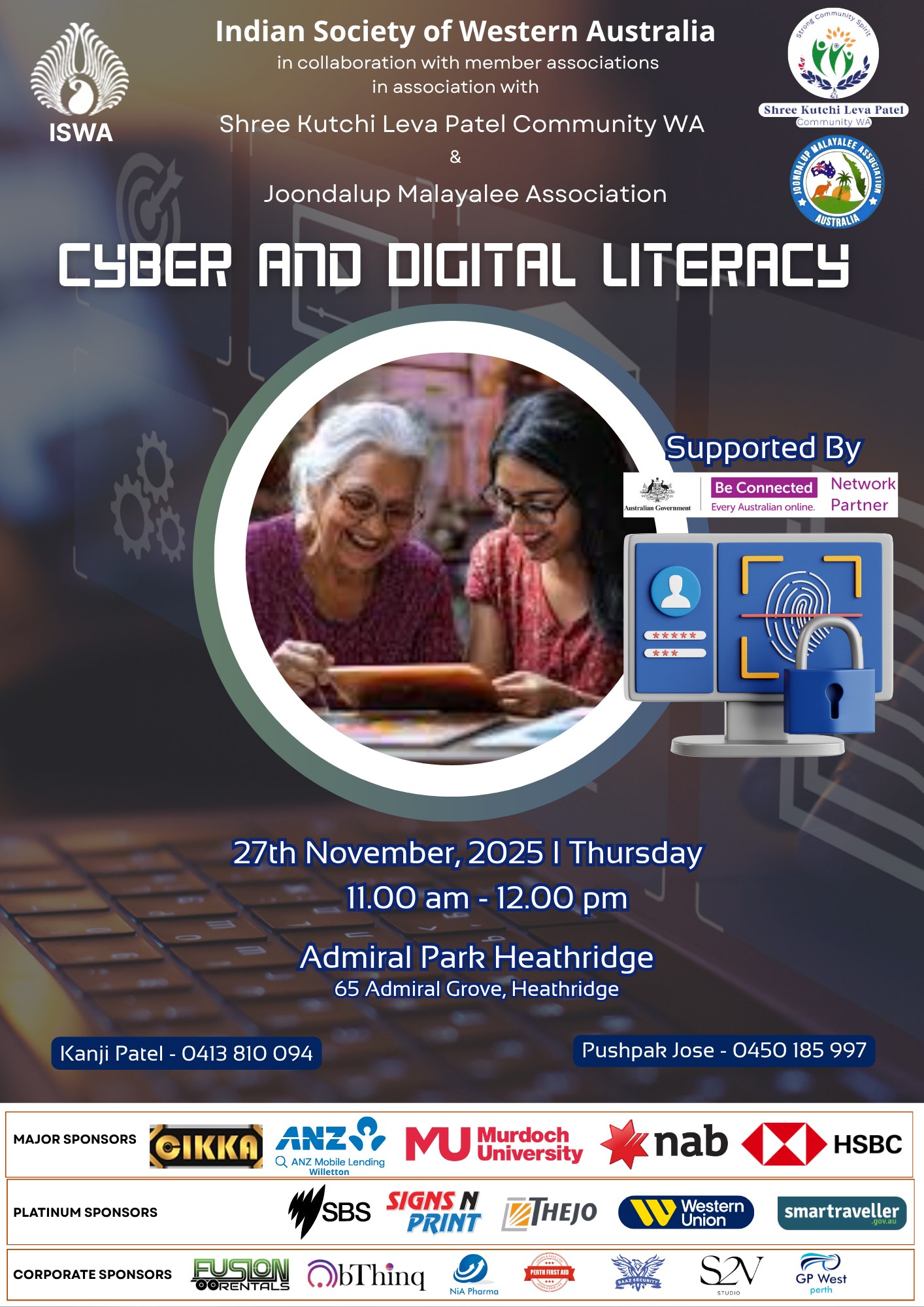 Join the Indian Society of WA in partnership with Shree Kutchi Leva Patel Community WA and Joondalup Malayalee Association for a practical and interactive session on staying safe online, managing your digital devices and learning essential cyber skills — specially tailored for senior community members!