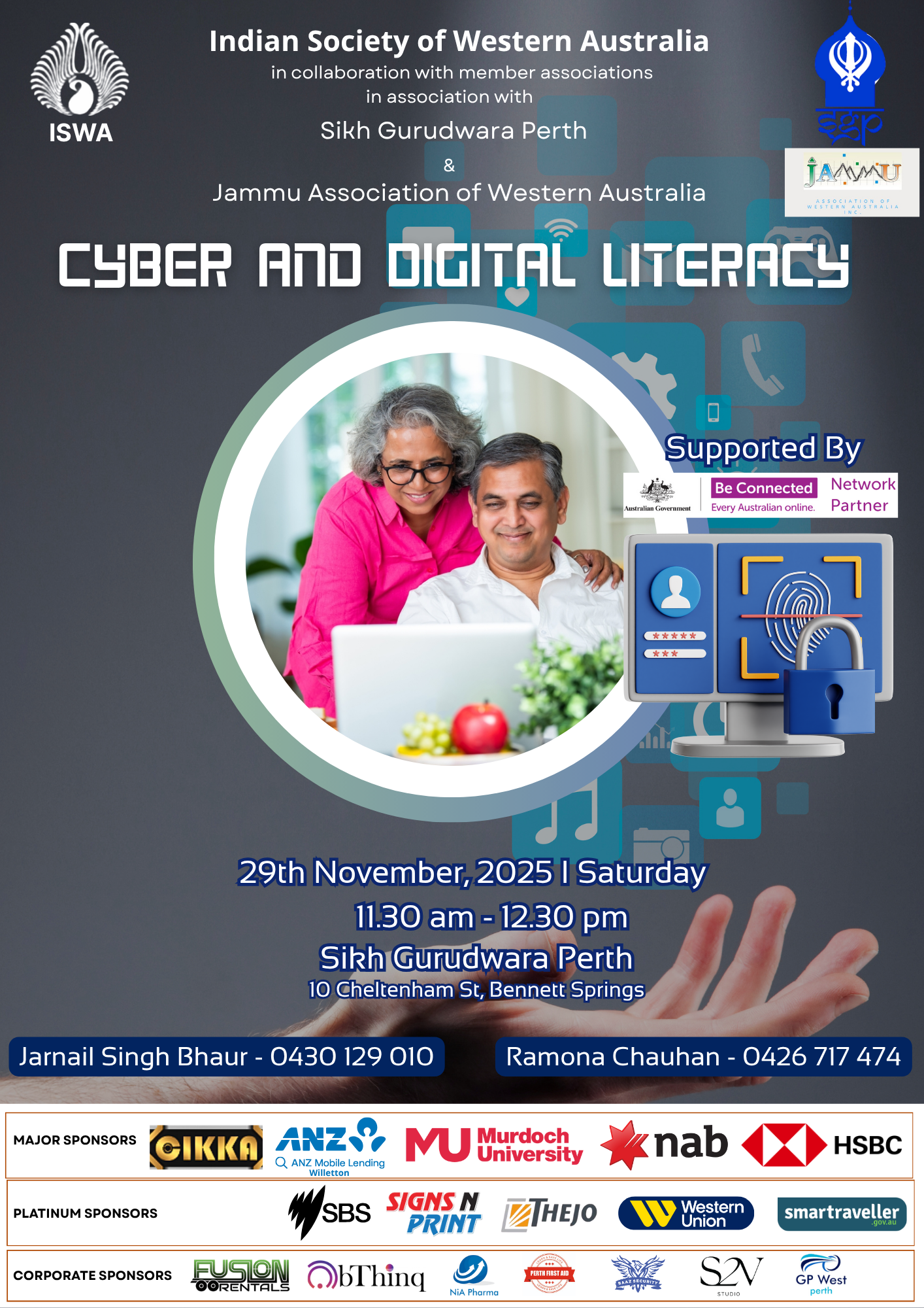 Join the Indian Society of WA in partnership with Sikh Gurudwara Perth and Jammu Association of WA for a practical and interactive session on staying safe online, managing your digital devices and learning essential cyber skills — specially tailored for senior community members!