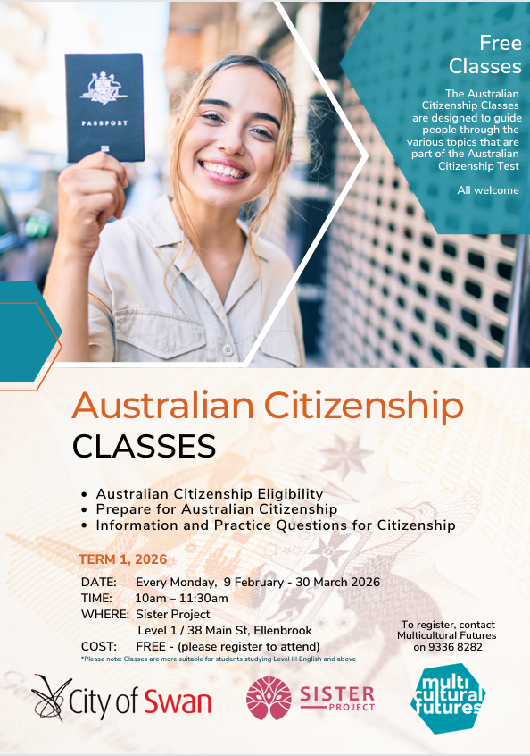 Multicultural Futures is offering Australian Citizenship Preparatory Classes in Ellenbrook to support people from culturally and linguistically diverse backgrounds on their pathway to citizenship. The classes are designed to guide people through the various topics that are part of the Australian Citizenship Test.