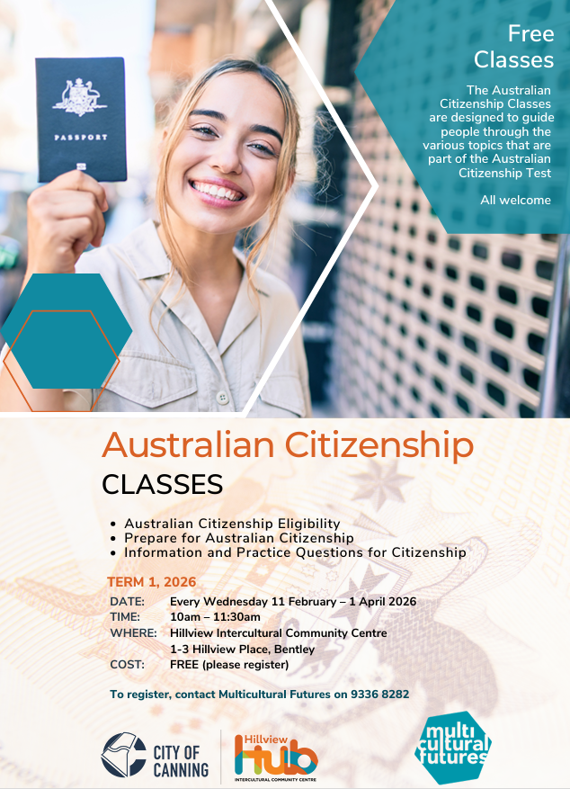 Multicultural Futures is offering Australian Citizenship Preparatory Classes in Bentley to support people from culturally and linguistically diverse backgrounds on their pathway to citizenship. The classes are designed to guide people through the various topics that are part of the Australian Citizenship Test.