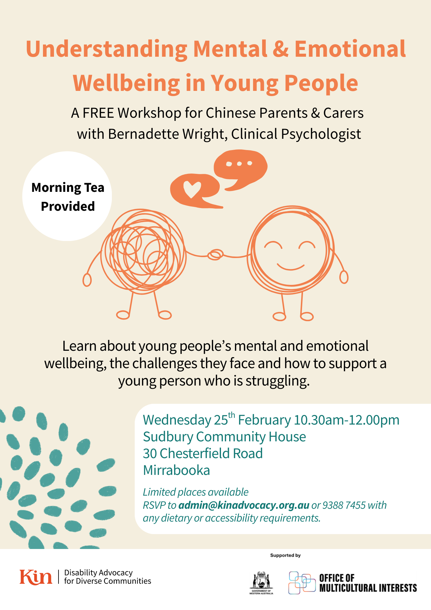 Kin Disability Advocacy will host a workshop on understanding mental and emotional wellbeing in young people for Chinese parents and carers of young people. Attendees can learn more about mental and emotional wellbeing, talking to a young person who is struggling as well as support services for young people and families.