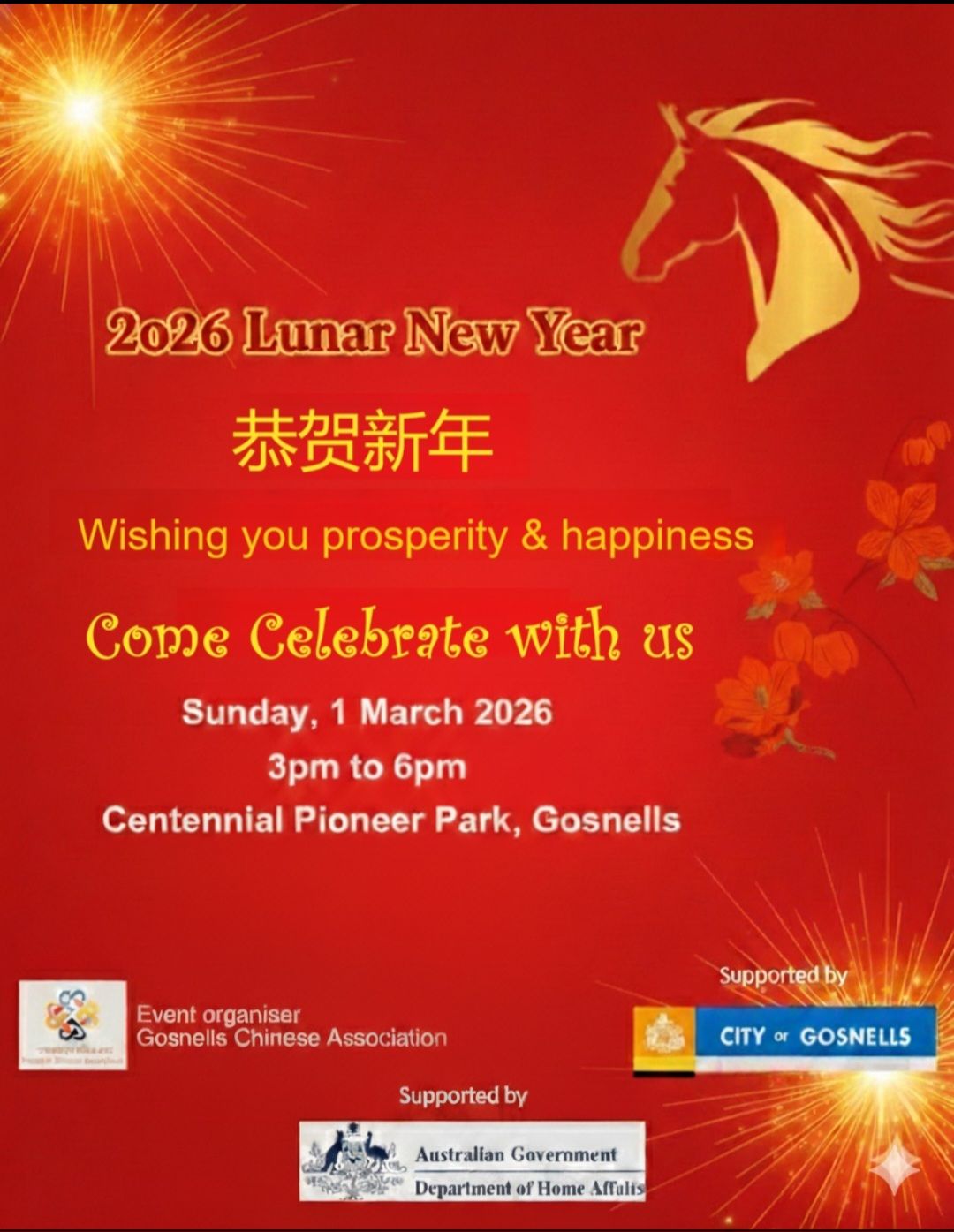 Join the Gosnells Chinese Association for the 2026 Lunar New Year Celebration! The event will embrace a rich multicultural flavour, showcasing performances from various culturally and linguistically diverse communities. Alongside much-loved performances such as traditional dances, instrumental performances, Lion Dance and martial arts demonstrations, the event will also include a variety of stalls offering unique cultural displays and products.
