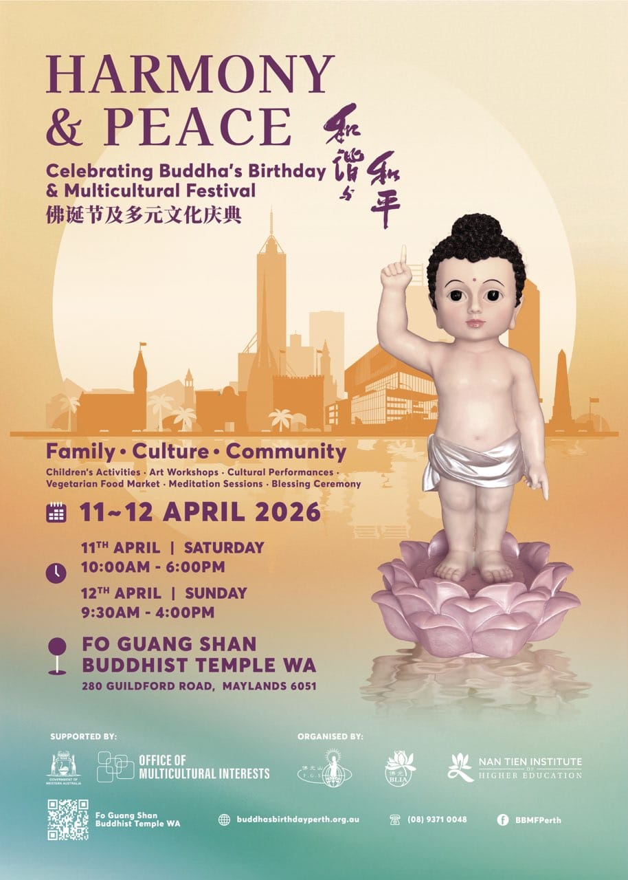Event details:When: 10:00 am to 6:00 pm Saturday 11 April 2026 and 9:30 am to 4:00 pm Sunday 12 April 2026Where: Fo Guang Shan Buddhist Temple WA, 280 Guildford Road, MaylandsCost: Free
