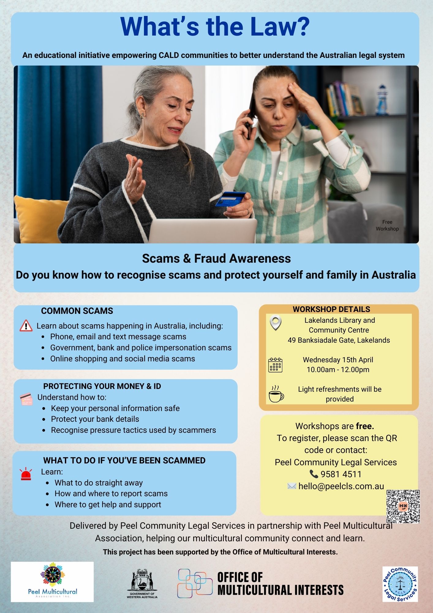 Join Peel Community Legal Services for What’s the Law: Scams and Fraud Awareness, a free community workshop designed especially for culturally and linguistically diverse communities. This session will help you recognise scams and protect yourself and family in Australia.